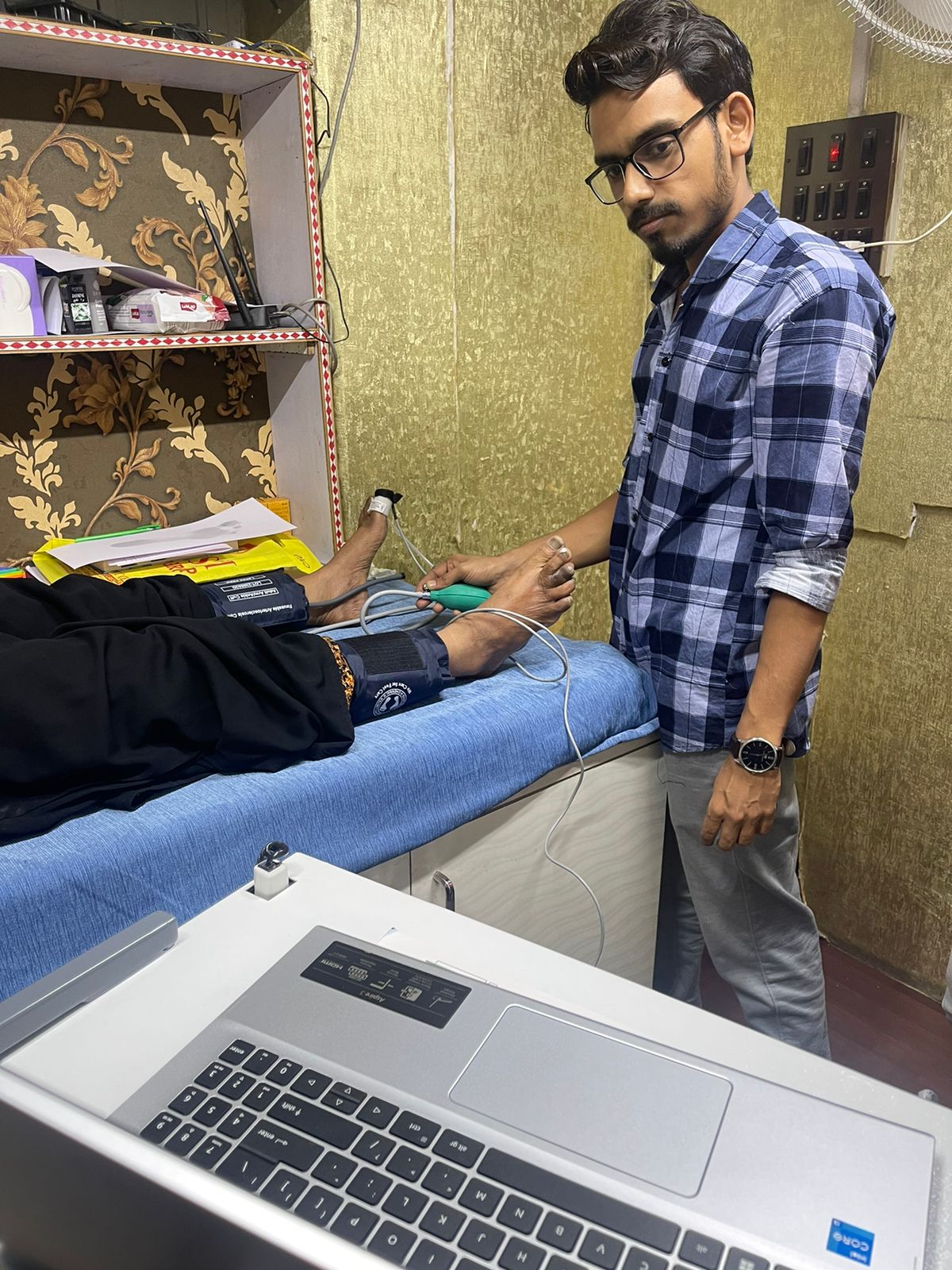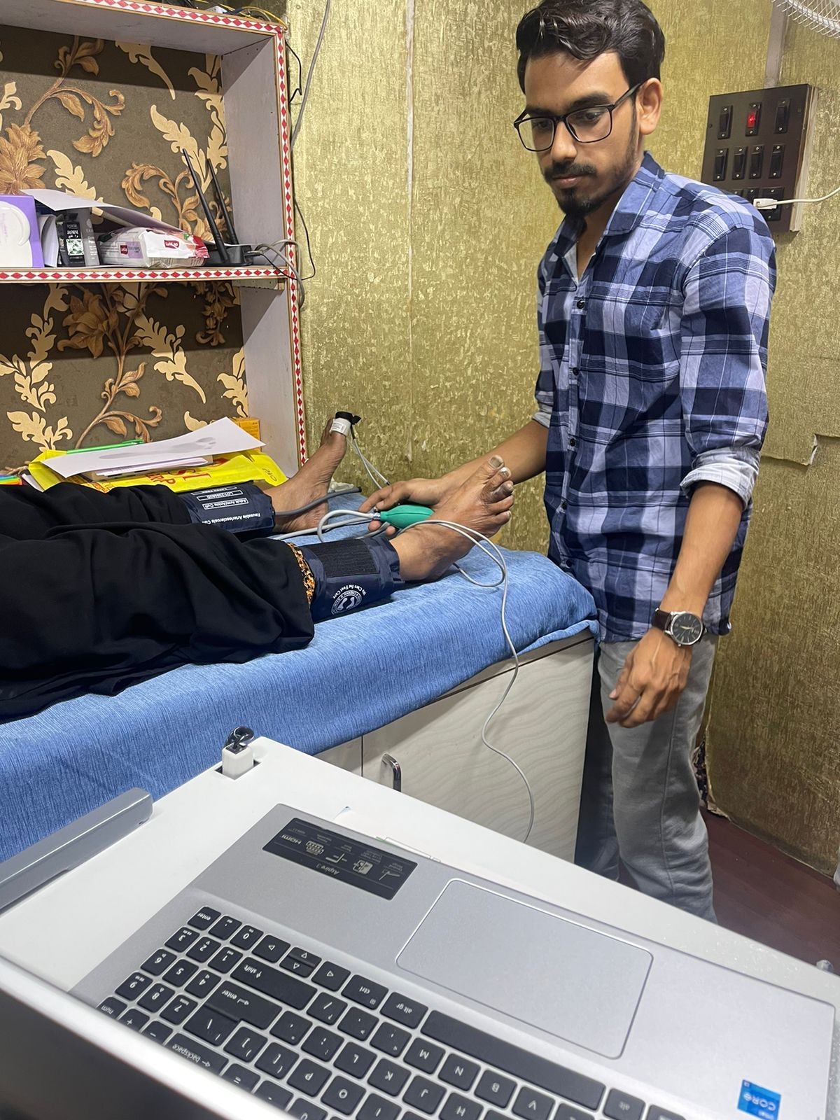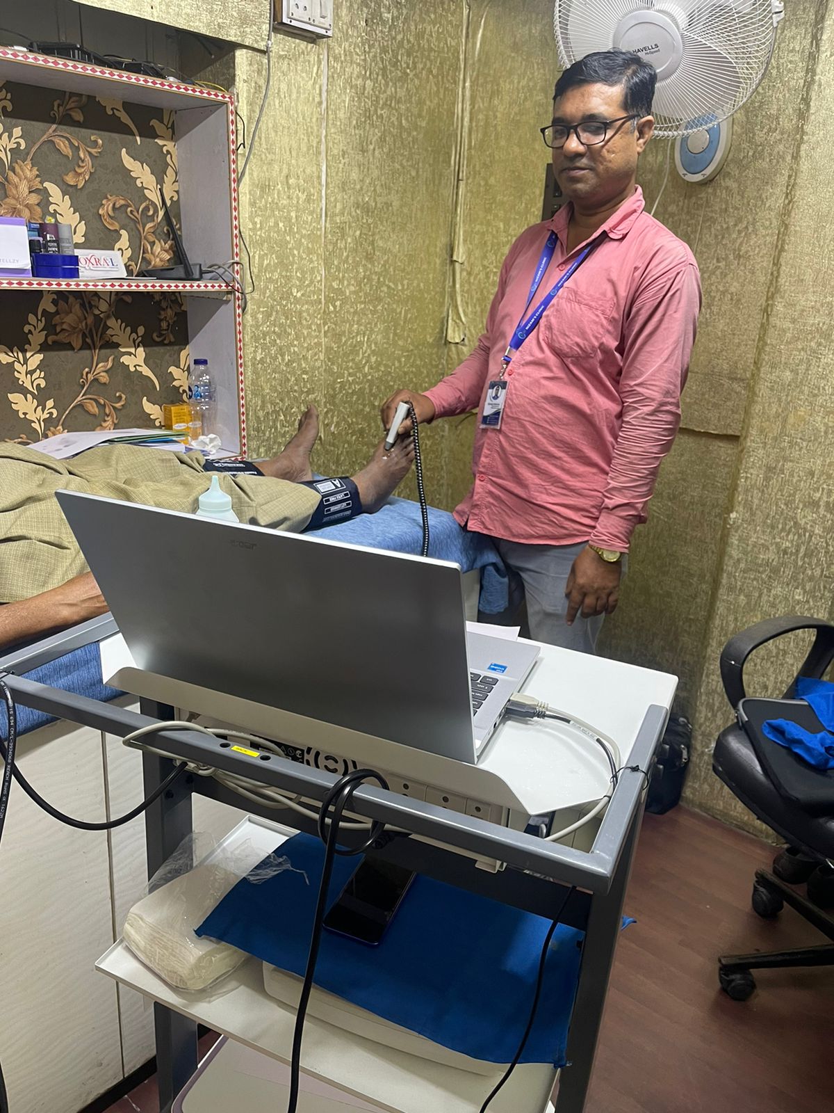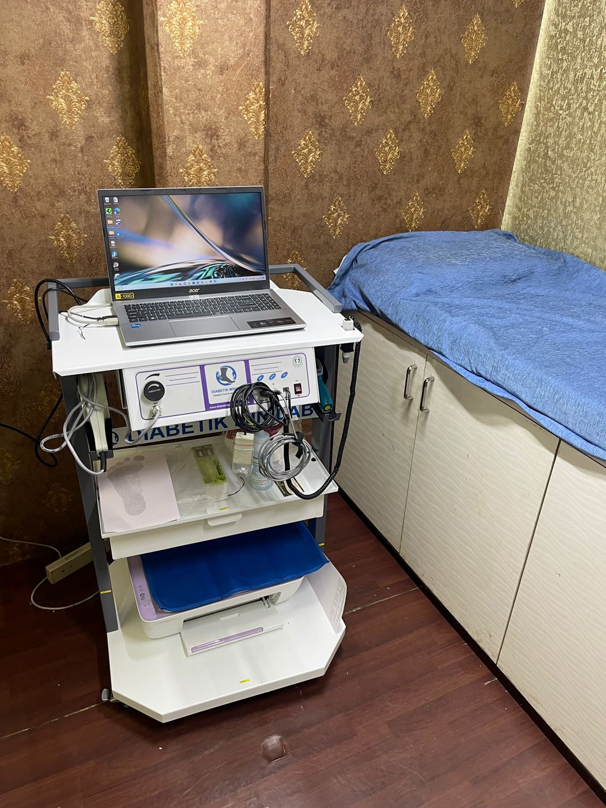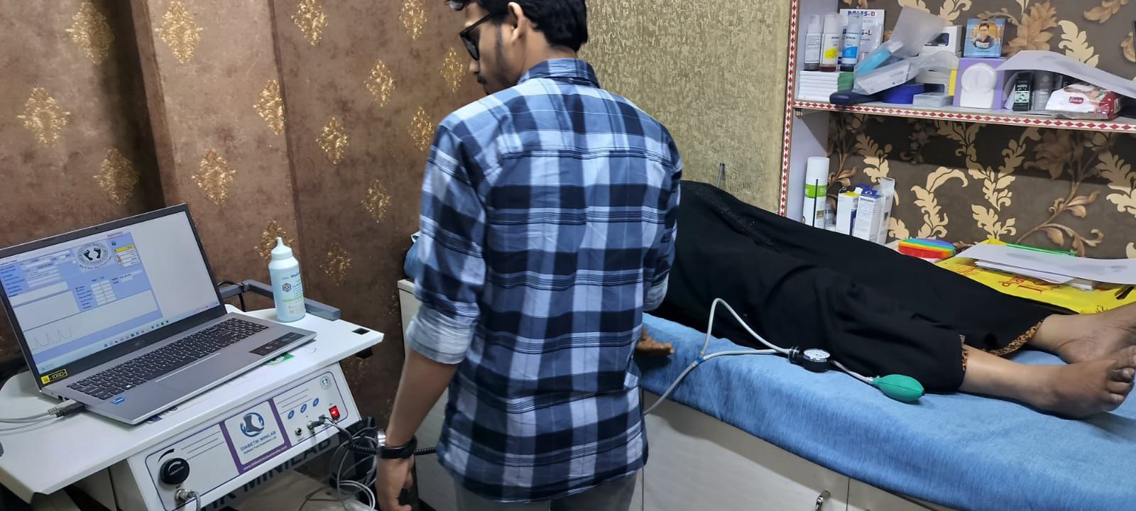 All-in-One Diabetic Foot Evaluation Lab model DIABETIK MINILAB is a semi-automated complete system that can measure and test Ankle Brachial Index -ABI, Toe Brachial Index -TBI, Doppler Velocity Waveform, Biothesiometry, Monofilament 10gm, Podiascan and Foot temperature. A master report captures the patient physical and medical history along with the measured data and given as one comprehensive report along with 5 pages of patient reports.